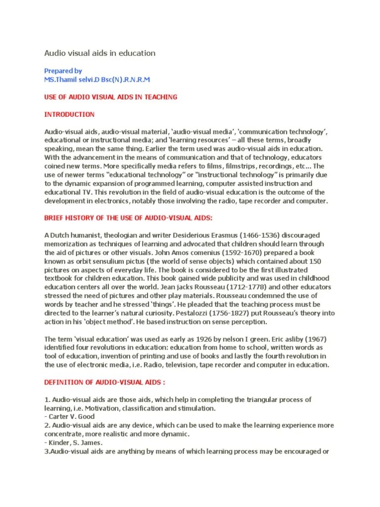 Audio visual materials are produced, distributed and used as planned components of educational programs. These things have been employed for many years in the classroom, where the object picture section and Audio visual materials are produced, distributed and used as planned components of educational programs. Careful planning of lessons ensures that the types of av aids selected … Audio visual aids presented by: (burton) visual aids are any instructional device that can be seen. Definition of audio visual aids: A.priyadharshini m.sc(n), lecturer, dept.of paediatrics, jai institute of nursing and research, gwalior... These things have been employed for many years in the classroom, where the object picture section and